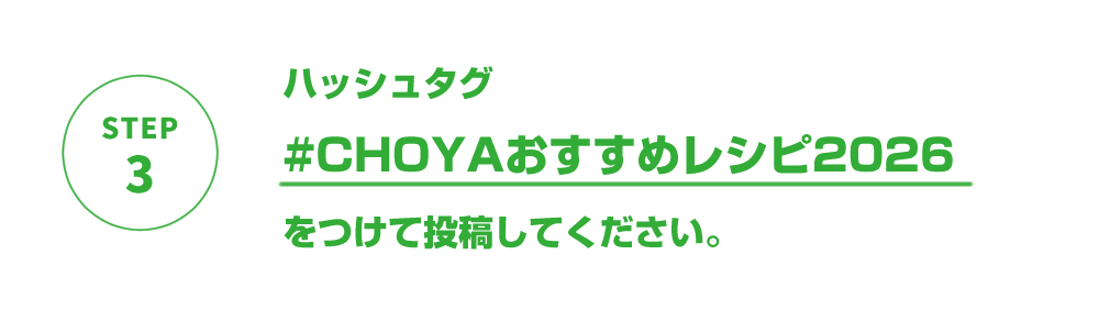 XまたはInstagramより、チョーヤ梅酒おすすめの飲み方の写真をご応募いただくアカウントで「CHOYA」公式アカウントX(@CHOYAofficial) または、Instagram(@choya_official)をフォローしてハッシュタグ「#CHOYAおすすめレシピ2026」をつけて投稿してください。 |