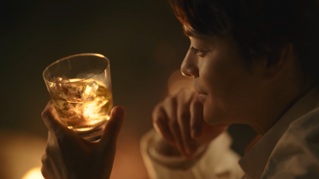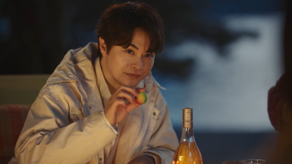 陽が落ちた、夜のはじまり。少しのランタンと丸い電飾で飾られたキャンプファイヤーエリアで、瀬戸康史さんは気の合う仲間と過ごす穏やかな時間を堪能します。その傍には「The CHOYA 熟成一年」が琥珀色に輝いている。グラスを見つめて「たっぷり…」と口ずさむ、瀬戸さんの満ち足りた表情にも注目です。